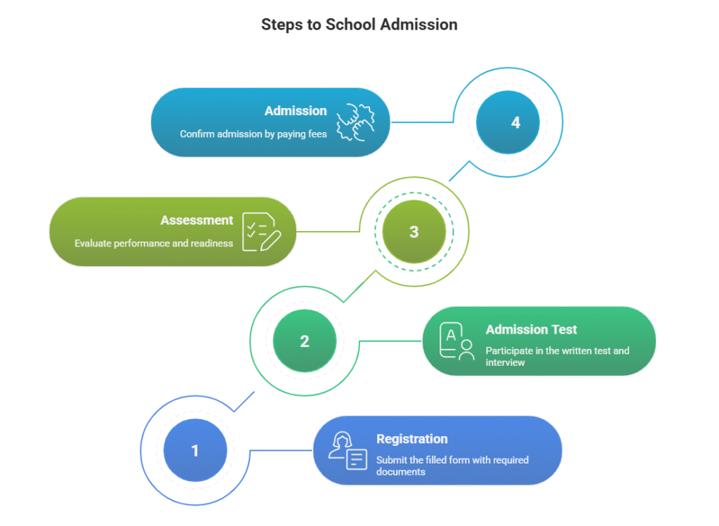 A duly filled form available from the school/website is to be submitted before the last date of registration.
